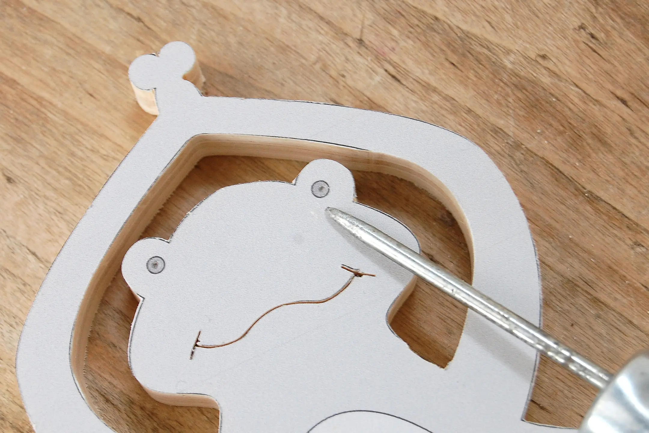Einfacher geht es kaum: Laubsägevorlage kopieren bzw. ausdrucken, abziehen und auf das Werkstück aufkleben.
